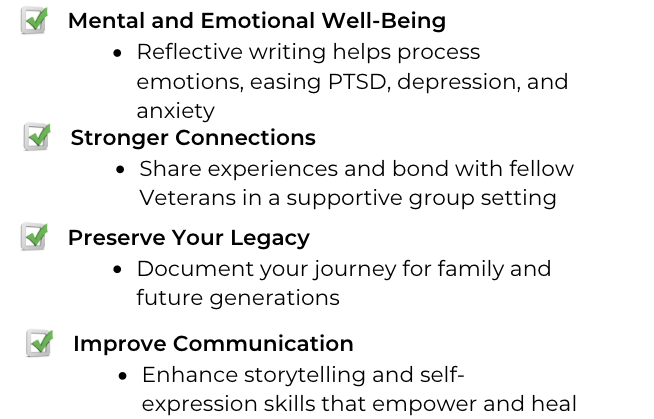 Your experiences matter. The Guided Autobiography for Veterans program offers a safe, supportive space where you can reflect on your journey, preserve your legacy, and build lasting connections with friends and family